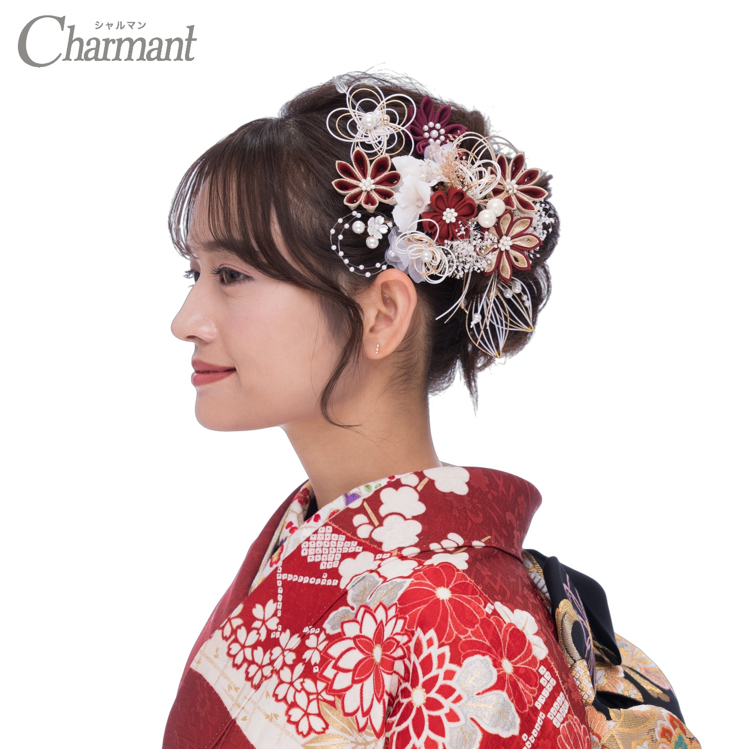 王道古典で華やかなつまみ細工をメインにかすみ草や水引のお花でやわらかい雰囲気も添えて